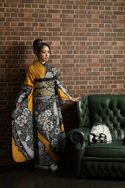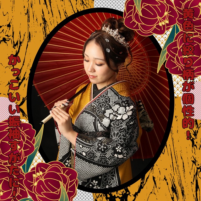 黄色に絞り柄が入った個性的な振袖です!
