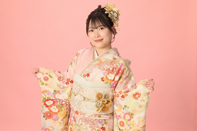 この記事では、ピンクの清楚系振袖を着てくださった