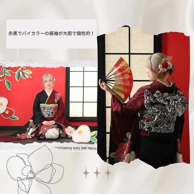 深い赤と黒の大胆な配色で色がはっきり切り替わる