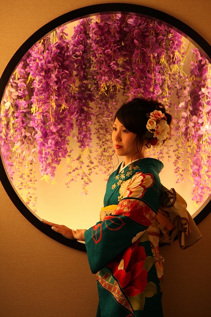 綺麗なブルーのお振袖が赤い背景にとても映えます♪