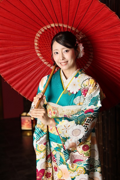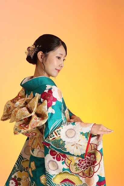 この記事では、青緑色の振袖を着てくださった