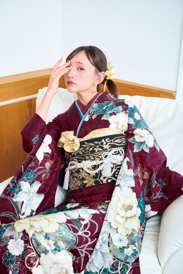 深いえんじにグリーンの花柄がめずらしくおしゃれ。可愛さだけでなく、エレガントな振袖。