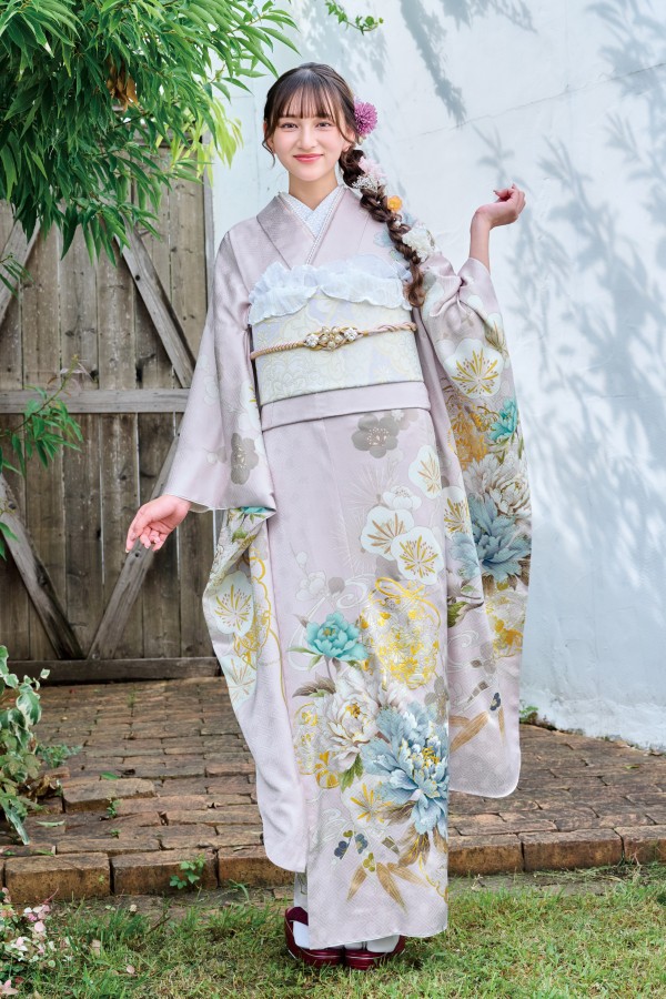 淡いくすみピンクが可愛い振袖です。水色の花柄が入ることでフェミニンな雰囲気に。
