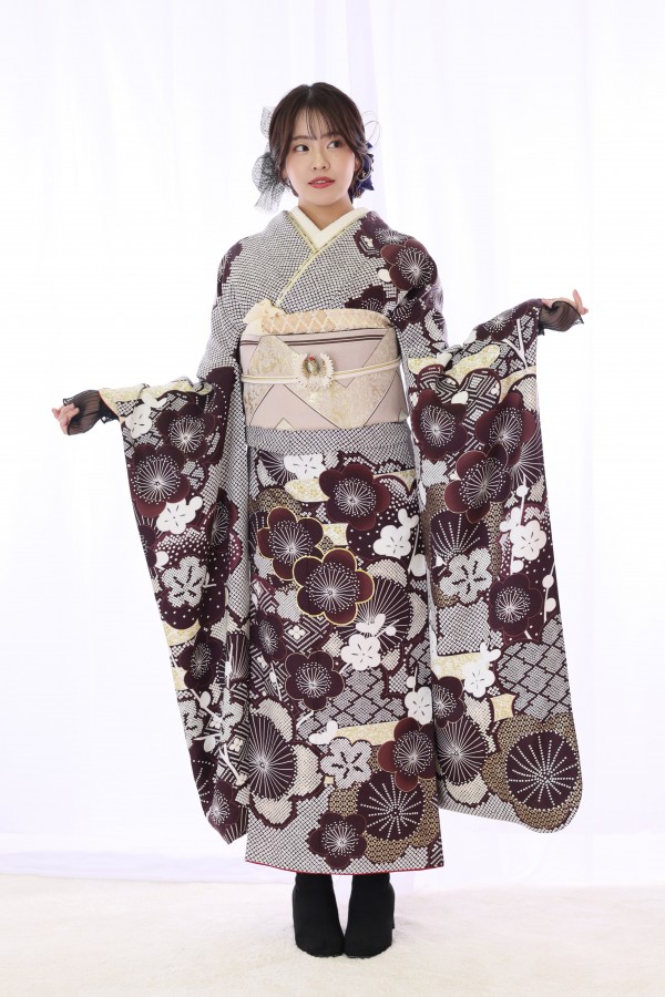 全体に絞り柄が入った個性的でおしゃれな振袖。ブーツでモダンな着こなしも叶えられる!