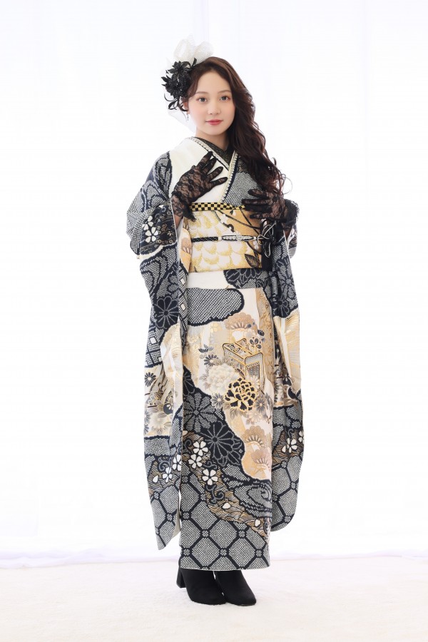 白と黒にゴールドがポイントになったかっこいい振袖!古典柄で伝統的なデザインを残しつつ、かっこいい着こなしに。