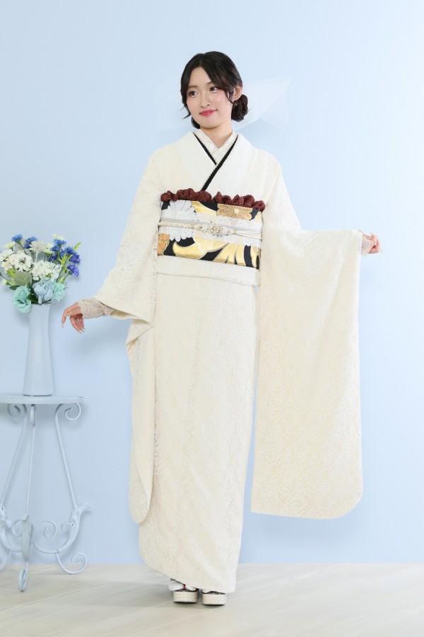 白の総レース振袖!人と被りたくないという方におすすめです。可愛い振袖ですが個性的に自分らしいコーデにも出来ます!