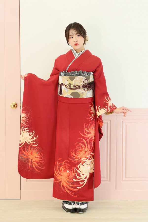 シンプルな赤振袖。大人っぽい菊柄でシックな雰囲気に!