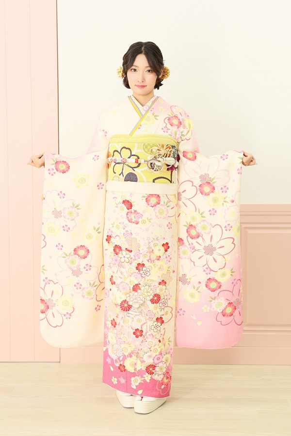 白地にピンクのグラデーションが可愛らしく、小花柄がたくさん入った上品デザイン。