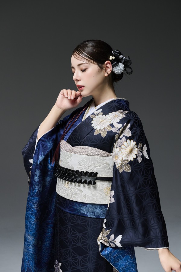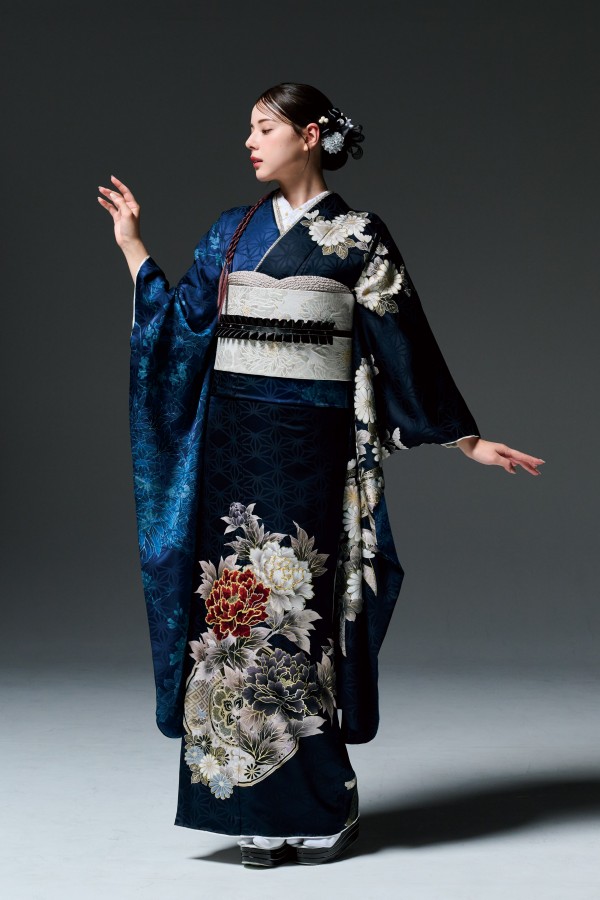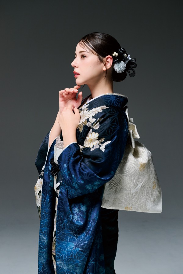 落ち着いた紺と、綺麗な青でアシンメトリーデザインで個性的!抜け感もあり華やかさも兼ね揃えた振袖