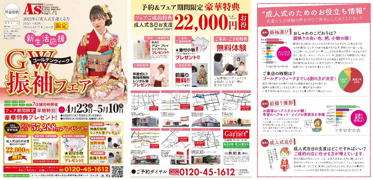 ガーネット各店舗(浜松・浜松西・袋井・静岡・静岡インター・富士・三島)では、4月23日(金)から5月10日(月)まで新生活応援♡GW振袖フェアを開催致します。