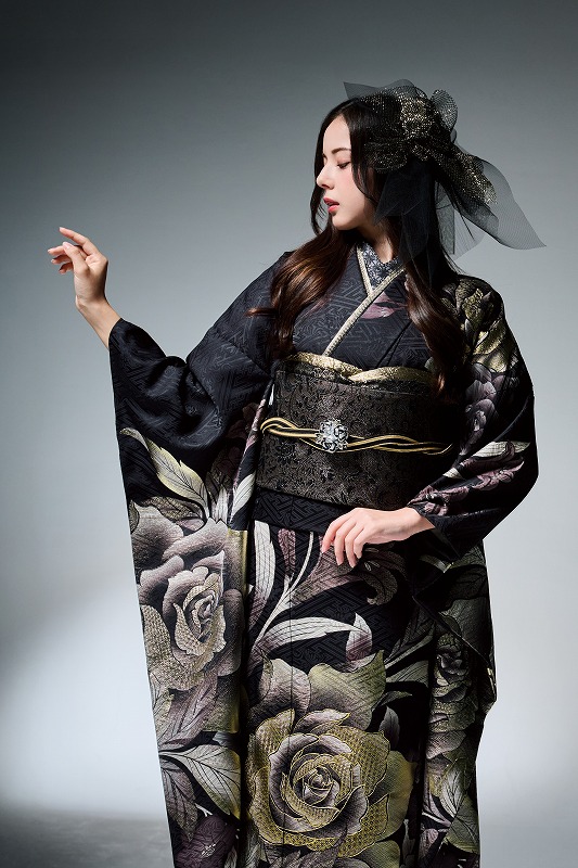 大きな牡丹や菊、桜などの古典柄が大胆に入ったデザインは、式典の場でも存在感抜群です。写真に残したときの華やかさは圧倒的。