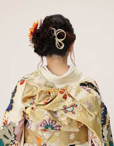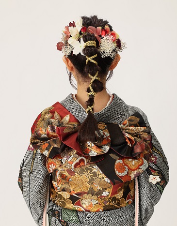 髪の毛を伸ばしたくない・・なんてお声も聞きますが、 そんなお嬢様にもってこいのヘアスタイルはベリーショートです☆ 髪飾りを最大限に引き立たせるために他の飾りは使わず、ヘアスタイルに目が行くようになっています(#^^#) こちらのお客様は撮影に向けて、ブルーブラックのおしゃれな髪色に染めてきていただきました! 最近は金箔や水引なんかをつけてかっこよくスタイリッシュにされるかたもいらっしゃいます。 最後はここ数年で圧倒的人気のシニヨンヘアです☆