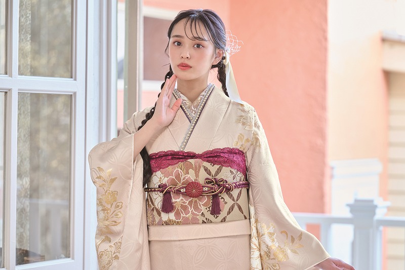 ピンクの振袖は、白や金、銀といった小物が合わせやすく、帯や髪飾りで個性を出すことができます。