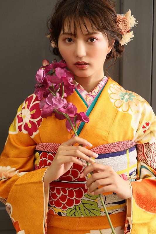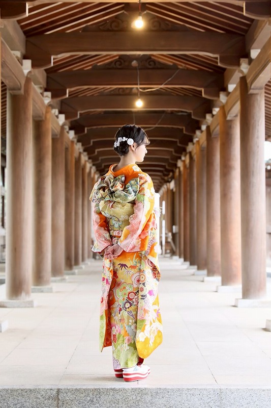 赤やピンクの振袖が多い中、オレンジはほどよく個性をアピールできます。