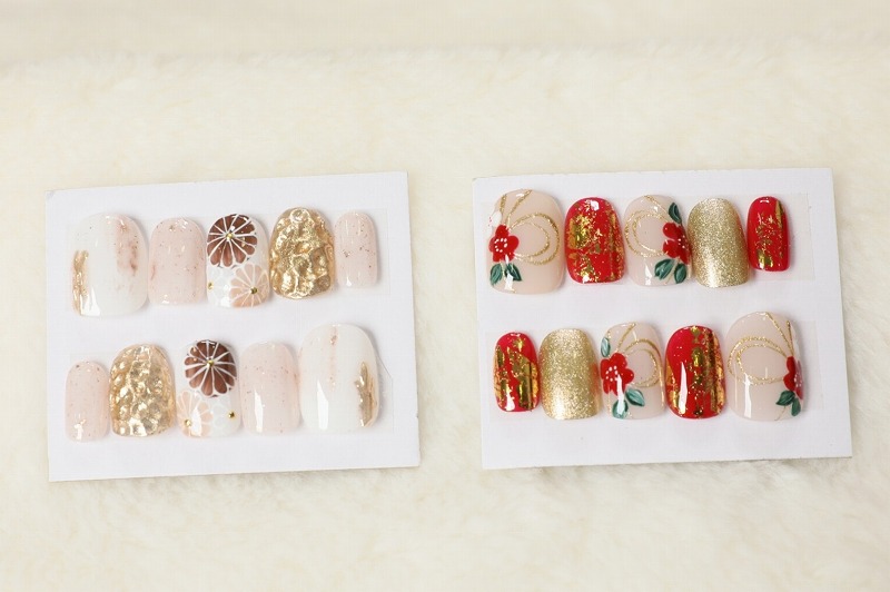 → 赤×金×白の大きめ花飾りにパールや飾りをプラス。写真映えするボリューム感が◎
