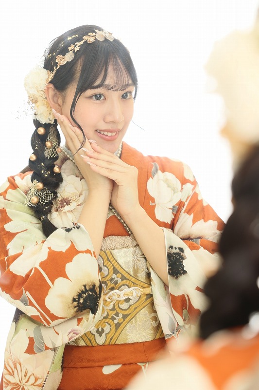 オレンジの振袖に繊細な輝きをプラスし、写真映えもばっちりです。