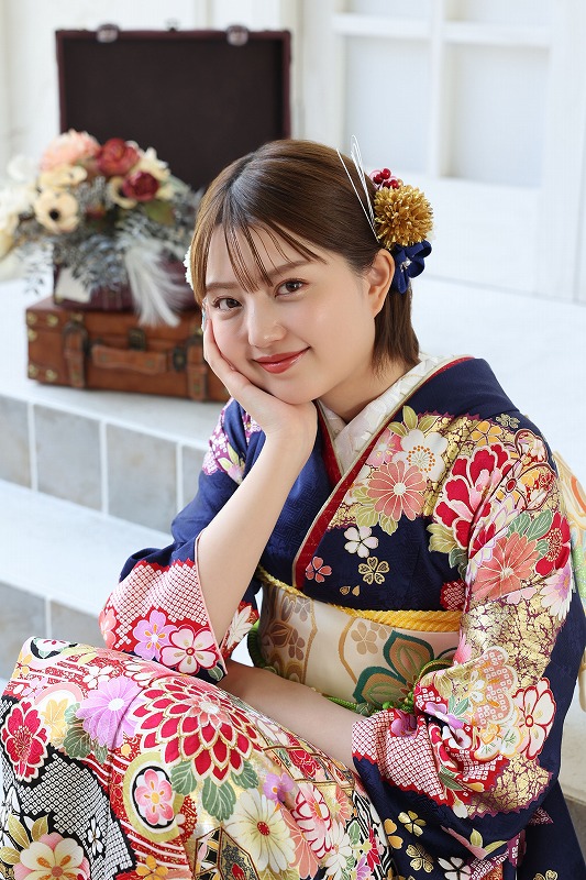 紺は肌を明るく、振袖の柄をくっきり見せてくれるため写真映え抜群です。