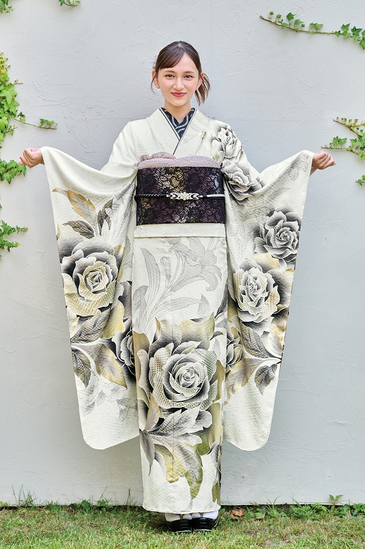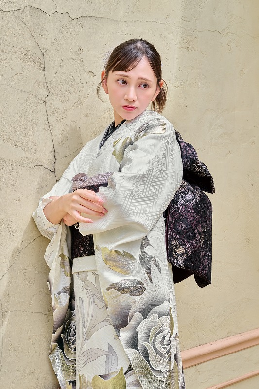 レース帯も似合う振袖で、和の振袖に洋を取り入れた、クールで今っぽいコーディネート。
