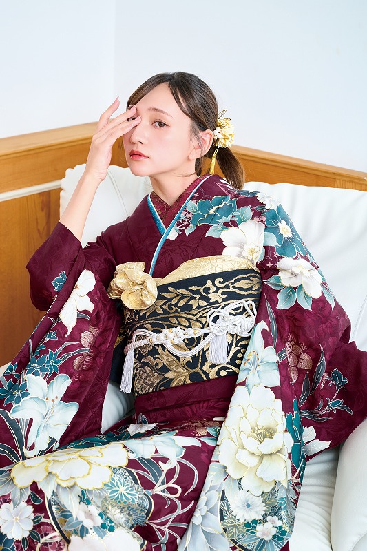 深みのあるえんじ色が印象的でクールの振袖です!