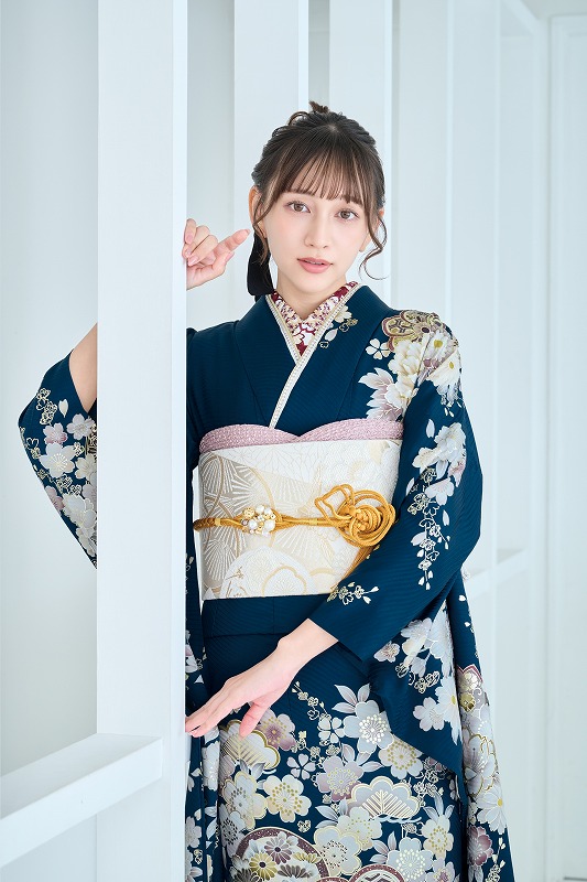 深みのあるネイビー地に、牡丹や菊、桜などの伝統的な花柄が贅沢に描かれた古典柄の振袖!