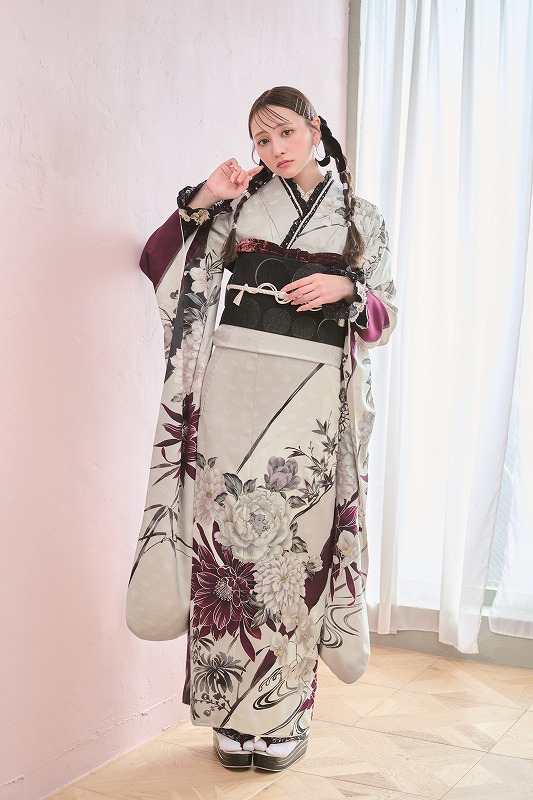 くすみカラー地に、大胆な大柄モダン柄。個性的な帯でアクセントをつけ、シンプルめの帯結びでこなれ感を演出します。