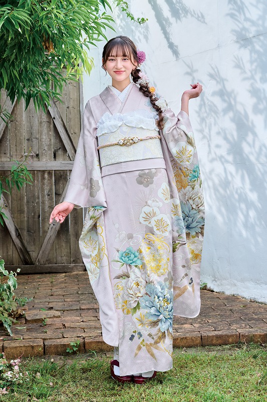 中〜大柄を選ぶと振袖の柄が映えます。胸元から裾にかけて流れるように配置されたダイナミックなデザインが特に似合い、身長を活かした堂々とした着こなしになります。